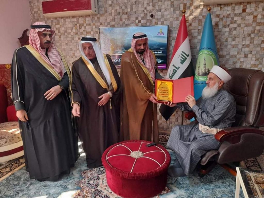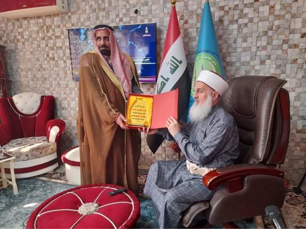 سماحة مفتي الجمهورية ” رعاه الله تعالى ” يلتقي وفد محافظة نينوى .التقى سماحة مفتي جمهورية العراق الشيخ الدكتور مهدي بن احمد الصميدعي ” رعاه الله تعالى ” في محل اقامته ببغداد صباح اليوم الاحد وفد محافظة نينوى تألف من الشيخ ويس عبد المحسن ال مرير والشيخ خليل عكاب غضب ال مرير والسيد كاظم جاد الله احمد والمقدم ابراهيم ويس حسين ال مرير وكانت الزيارة للسلام والاطمئنان على سماحة المفتي ” رعاه الله تعالى ” هذا وابدى الوفد سلامه وتحياته لسماحة المفتي سائلين الله لسماحته الشفاء العاجل كما واهدى الوفد سماحة المفتي درع شكر وتقدير لجهوده الكبيرة في سعيه الى وحدة الصف وتوحيد ونبذ الفرقة ، من جهته رحب سماحته بالوفد سائلا الله ان يحفظهم وفي الختام حمل سماحته سلامه وتحياته الى جميع ابناء محافظة نينوى سائلا الله ان يبعده عنها دعاة الفتنة واهل الحرابة .