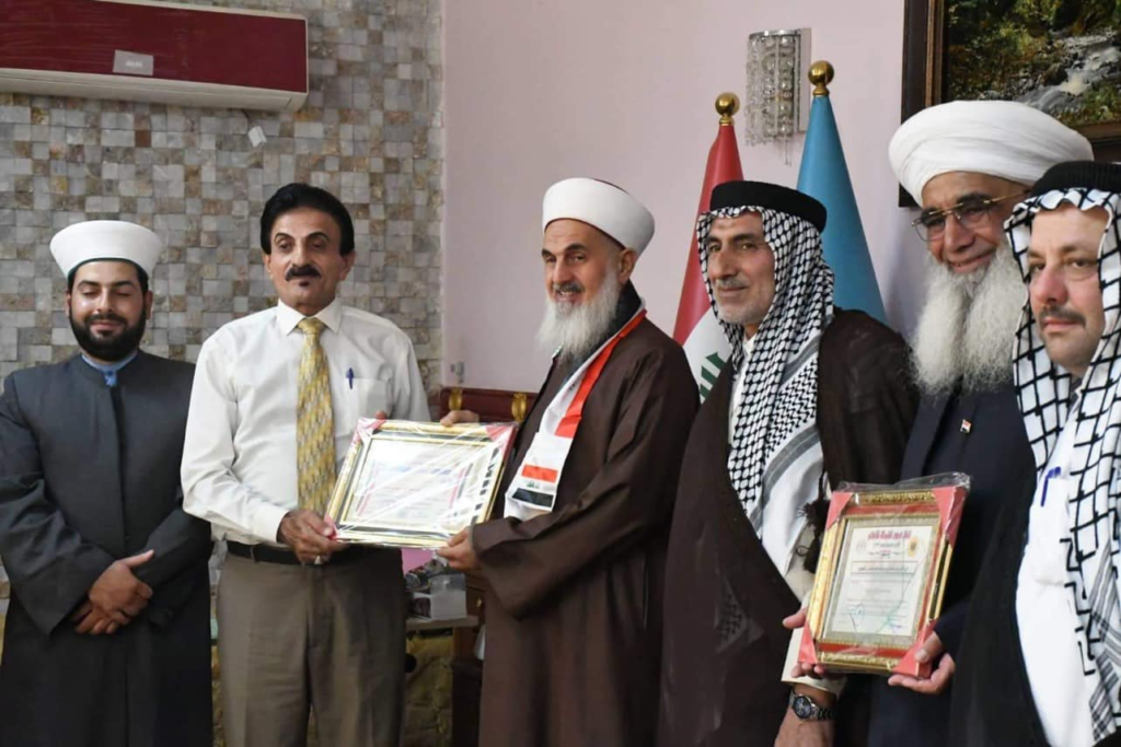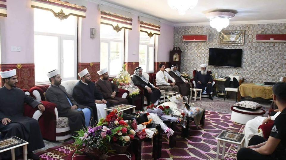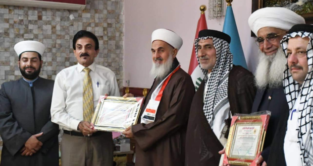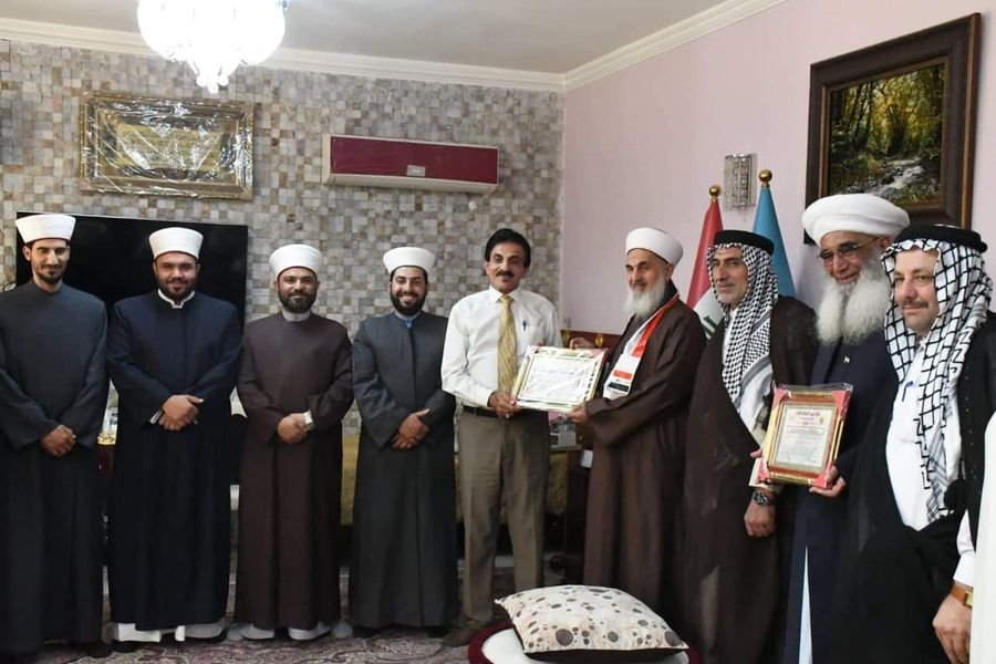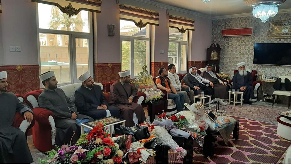 كانت الزيارة لتكريم سماحة المفتي بوشاح العلم العراقي وشهادة ( رجل السلام لعام 2022 ) لمواقف سماحته الوطنية وصوته المعتدل الداعي للسلام وحقوق الانسان والتعايش السلمي الذي يعتبر سماحته فاكهة الحب والمودة والسلام بين المسلمين والعراقيين جميعا ..