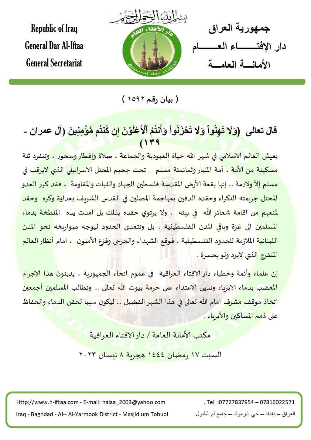 بيان رقم ( 1956 ) ضرب المصلين في فلسطين .. نشرت بواسطة: admin في قسم البيانات أبريل 8, 2023 التعليقات على بيان رقم ( 1956 ) ضرب المصلين في فلسطين .. مغلقة 60 زيارة 2023-04-08 admin tweet