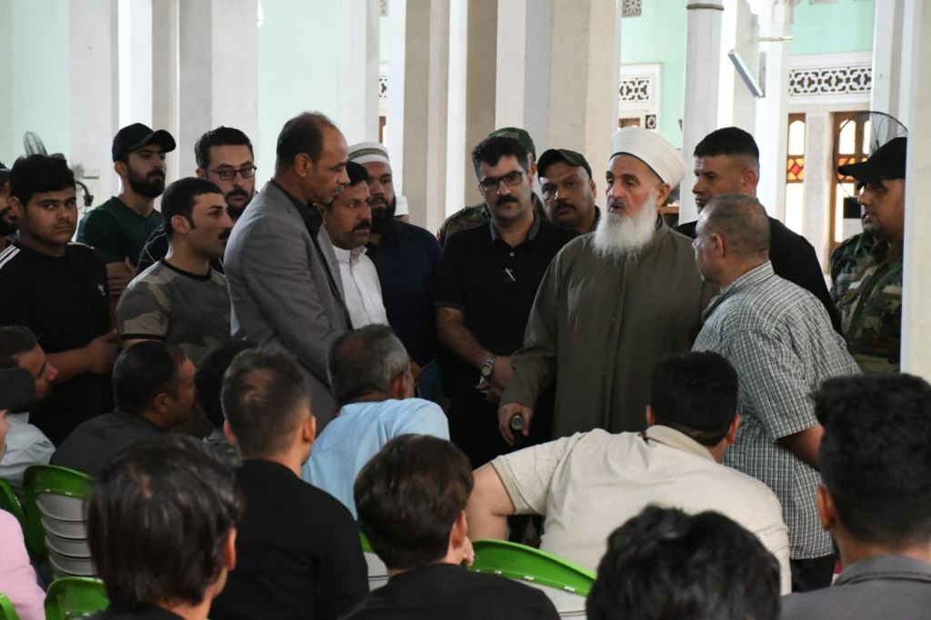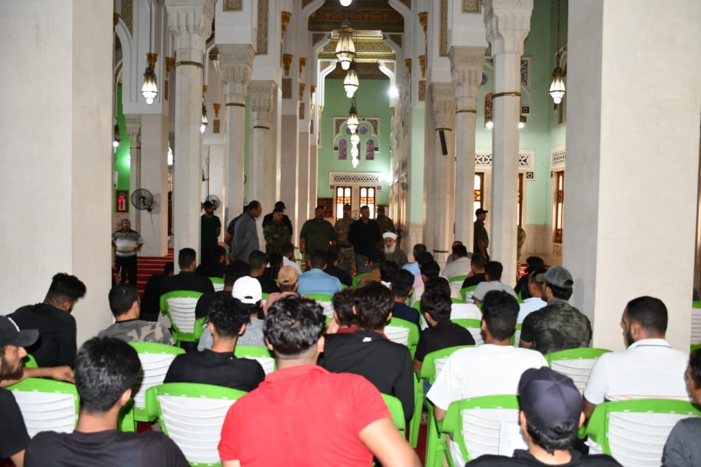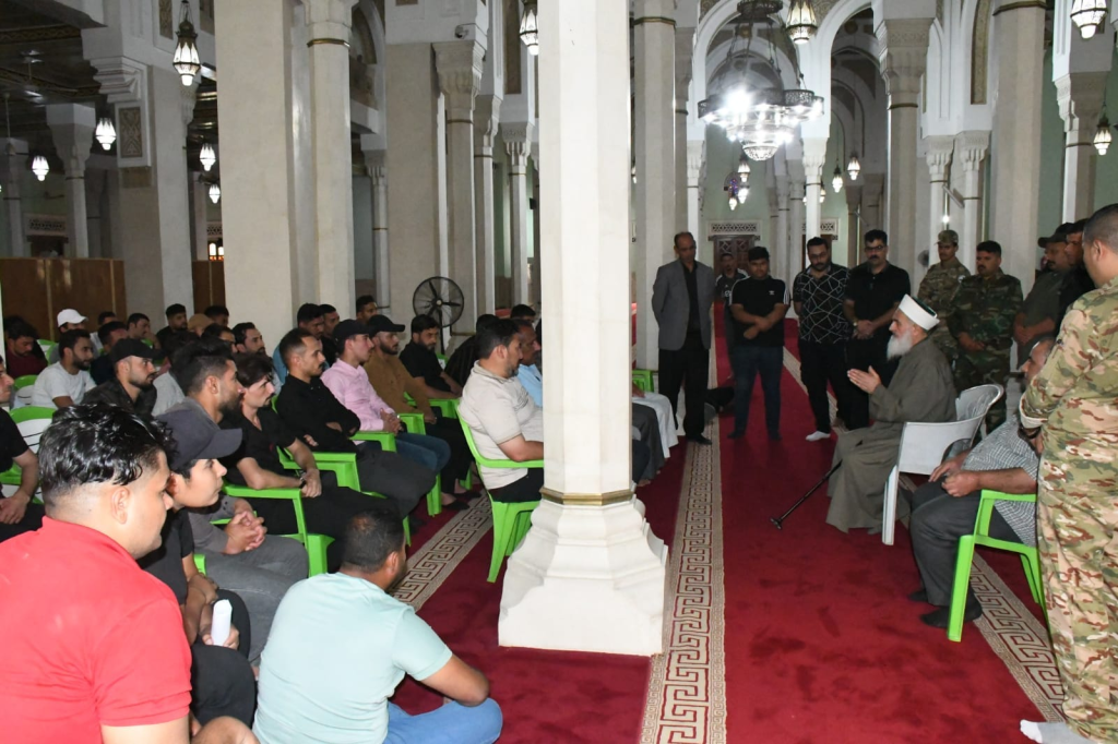 مفتي الجمهورية يلتقي في حرم جامع أم الطبول الجامع الأم عددا من الشباب المتطوعين في صفوف أحرار العراق من قضاء الفلوجة بعد الوقفة التضمانية التي وقفوها على الحدود العراقية مع كثير من العراق.