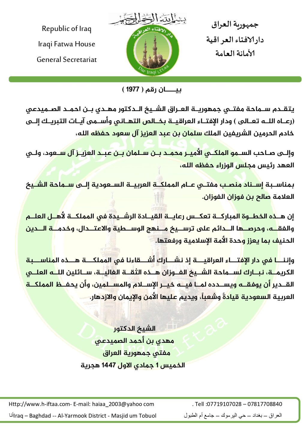 يتقدم سماحة مفتي جمهورية العراق الشيخ الدكتور مهدي بن احمد الصميدعي (رعاه الله تعالى ) ودار الإفتاء العراقية بخالص التهاني وأسمى آيات التبريك إلى خادم الحرمين الشريفين الملك سلمان بن عبد العزيز آل سعود حفظه الله،