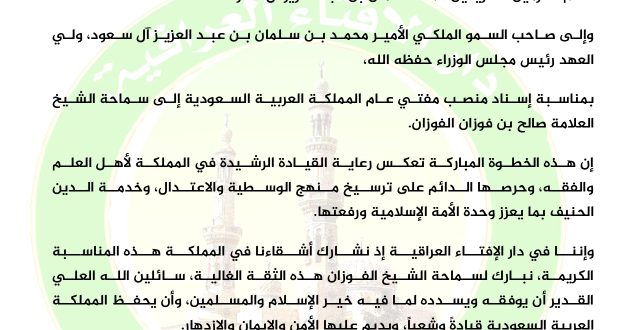 وإننا في دار الإفتاء العراقية إذ نشارك أشقاءنا في المملكة هذه المناسبة الكريمة، نبارك لسماحة الشيخ الفوزان هذه الثقة الغالية، سائلين الله العلي القدير أن يوفقه ويسدده لما فيه خير الإسلام والمسلمين، وأن يحفظ المملكة العربية السعودية قيادةً وشعباً، ويديم عليها الأمن والإيمان والازدهار.